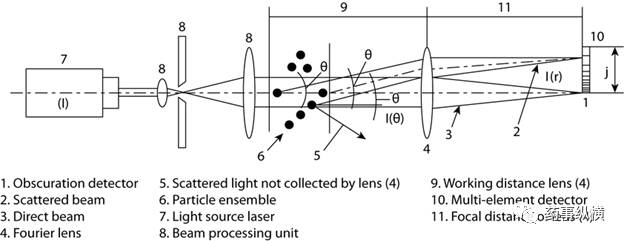 外来光束和分散的粒子的交互作用导致在不同角度的不同光强度散射状态。由直接光和散射光组成的总体角度强度分布,然后被集中到由一个透镜或者一系列透镜构成的多元素检测器上。这些透镜产生一个散射状态,在限度内,它不依赖粒子在光束中的位置。因此,这个连续的角度长度分布在一个检测器元素装置上转化为一个离散的空间强度分布。