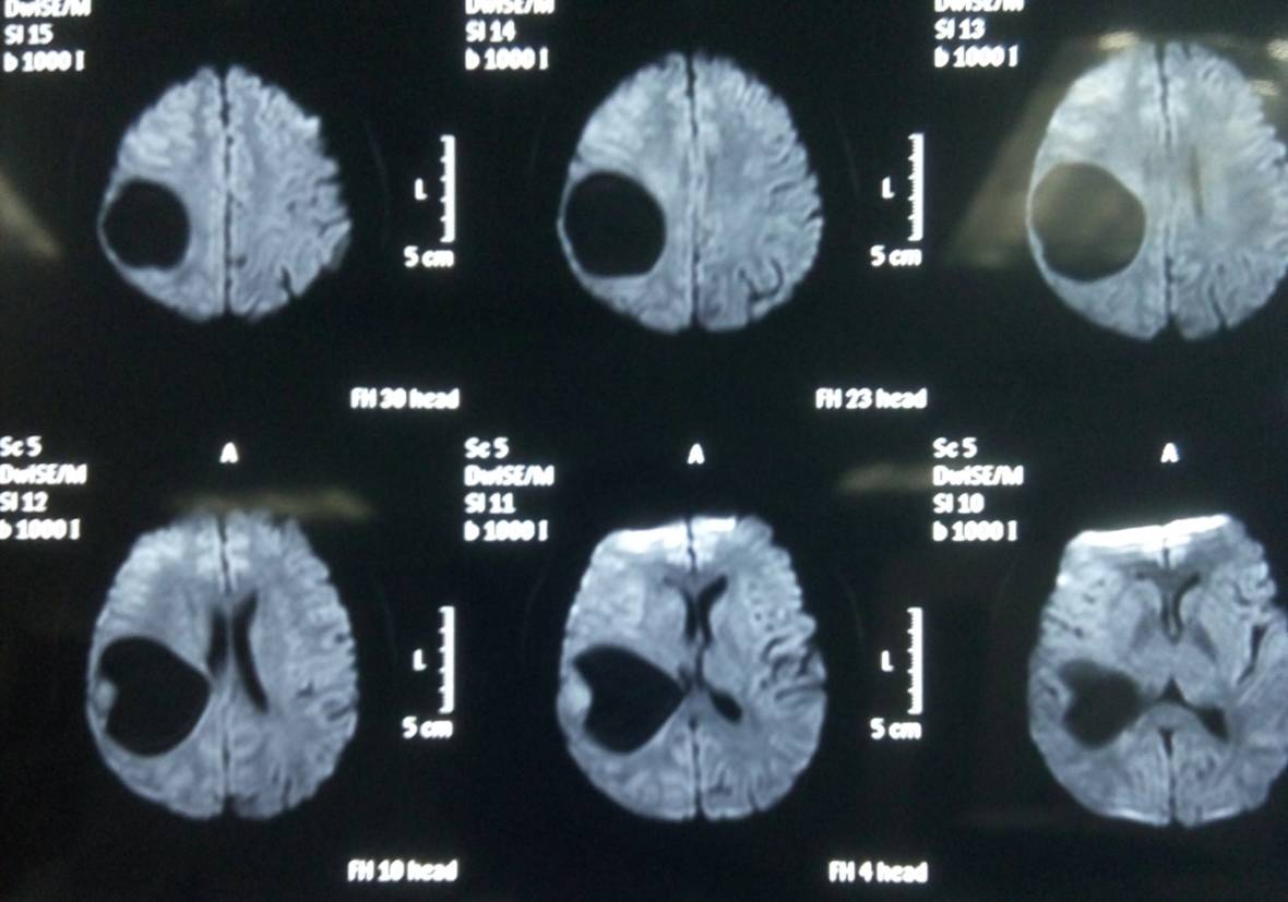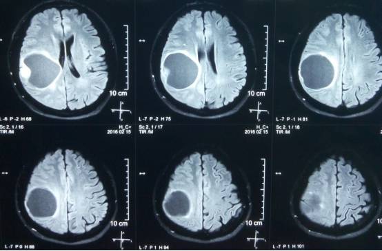 头颅MR示:右颞顶囊性占位伴结节,考虑胶质瘤可能。MRI T1为等信号(图1);T2囊液为高信号(图2);结节为均匀增强(图3);弥散相显示弥散受限(图4)。