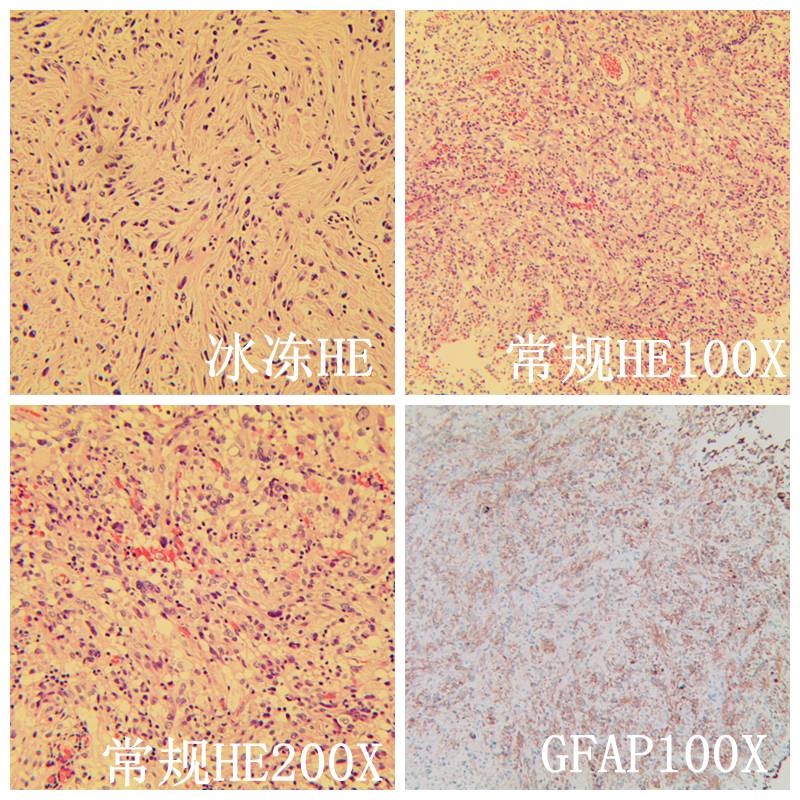 术后病理示:快速病理考虑星形胶质细胞瘤III级。GFAP(+),Oligo-2(+),S-100 (+),CD56(+),Vimentin(+),CK( -),Ki-67(10%)。