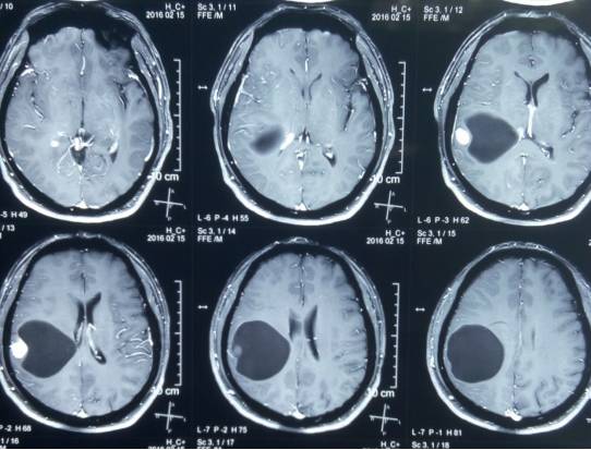 2016年02月26日在术中电生理监护下行脑肿瘤切除术,切开硬膜,脑表面未见异常;,,见极片34之间电位反转,。术中B超下定位囊变,以及下极见实性高回声区约1.5公分大小。保护好血管,,下方约见灰红色肿瘤,送快速病理,部分质地韧,血供丰富;大小约1.5*1.5*1左右;内侧有囊液,淡黄清亮。快速病理提示星瘤三级,肿瘤全切,探查囊壁,未见肿瘤,肿瘤全切。