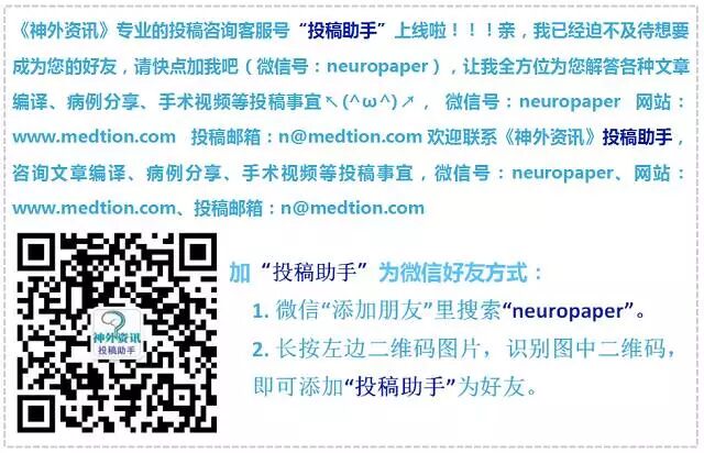 《神外资讯》,未经许可不得转载,如希望转载,请联系“神外助手”。请各微信公众号、网站及客户端尊重《神外资讯》版权,经许可转载文章时请清楚注明来源为“神外资讯”。《神外资讯》,欢迎您转发朋友圈。