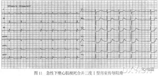 5. 1. 2. 1 下壁心肌梗死合并房室传导阻滞阻滞部位多在房室结, 心电图常表现为一度、二度Ⅰ型或三度房室传导阻滞 (图 8、11) 。该房室传导阻滞多为暂时性的, 常在 2 周内恢复, 不需要植入永久性心脏起搏器。