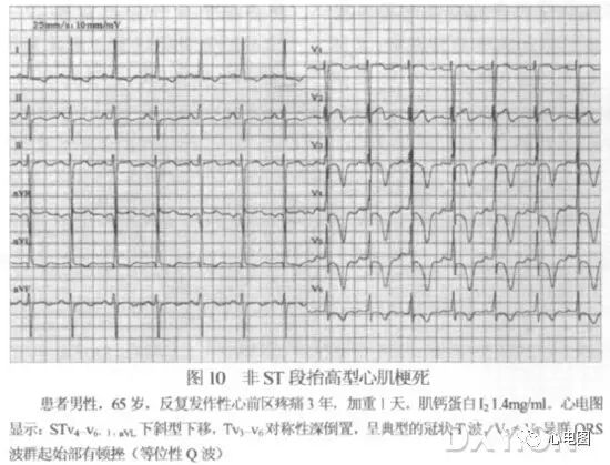 一般来说, 胸痛患者心电图在某一区域出现 ST 段抬高并伴有心肌坏死标记物升高, 即表明对应的冠脉已经闭塞而导致心肌全层损伤, 对此临床上可诊断为 ST 段抬高型心肌梗死。此类患者绝大多数进展为较大面积的 Q 波型心梗。胸痛如不伴有 ST 段抬高, 常提示相应的冠脉尚未完全闭塞, 心肌损伤尚未波及心肌全层, 心电图多表现为 ST 段下移或 T 波倒置 (图 10) 。此类患者若同时有心肌坏死标记物或心肌酶升高, 仍说明有心肌坏死, 只是范围较小 (未波及心肌全层) , 临床上称之为非 ST 段抬高型心肌梗死。但此类心梗若处置不当, 也可进展为 ST 段抬高型心肌梗死。