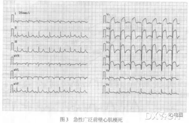3. 1 ST 段抬高型和非 ST 段抬高型心肌梗死研究发现: ST 段抬高型心肌梗死可以不出现 Q 波 (图 8、9) , 而非 ST 段抬高型心肌梗死有的可出现 Q 波。心电图出现的 Q 波是心肌坏死的标志, 是否出现 Q 波是一种回顾性分类。临床对 ST 段抬高型和非 ST 段抬高型梗死两者的干预对策是不同的。以 ST 段改变代替传统的 Q 波分类突出了早期干预的重要性。即在 Q 波出现之前及时进行 (溶栓、介入治疗等) 干预, 可挽救濒临坏死的心肌或减小梗死面积。![]()