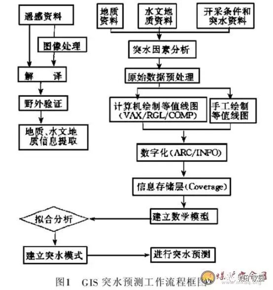 煤层底板突水是多因素综合影响的结果, 各自起着不同的作用, 用传统的方法已经不可能很好地解决所面临问题. 多源地学信息复合叠置法是随着计算机技术和遥感技术发展起来的, 是多源地学信息(地理信息、地质信息、遥感信息等) 进行综合处理的一种新方法, 该方法在地理信息系统(GIS) 平台的支持下, 对多种地学信息进行叠置复合后, 通过空间分析功能得到能够供决策的新信息. 通过收集矿区的开拓图、水文地质图、地质报告和已有的突水资料等, 分析找出主要突水因素, 进行采集与量化, 利用ArcGIS软件的空间分析功能, 把影响煤层底板突水的多种因素经过处理、加工, 形成可供量化的信息源, 进行信息复合叠置, 从而构建底板突水预测模型, 作出预测预报, 预测流程如图1所示.