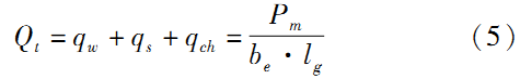 在磨削斜齿轮时,砂轮磨除金属材料时会产生极高的热量并流入工件表面,这导致齿面温度升高,因此要对进入磨削区的热量进行计算。干磨工况下假设这些热量全部传入齿面、砂轮和磨屑中,所以磨削弧内总热流密度Qt分别进入齿面的热流密度qw、砂轮的热流密度qs和磨屑的热流密度qch。而总热流密度Qt可根据单位接触面积belg和机床主轴传递给砂轮的磨削功率Pm来计算,即有:
