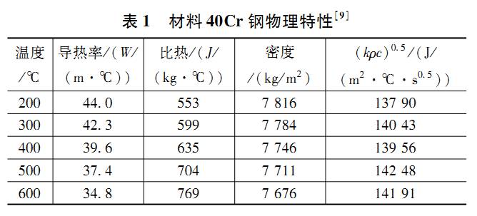 斜齿轮参数为:左旋,螺旋角β=16°,模数m=5 mm,齿数Z=25,压力角α=20°,齿顶高系数ha*=1,顶隙系数c*=0.25,齿宽B=30 mm。齿轮材料为40Cr钢,熔点Tm=1 400°。砂轮材料为棕刚玉,导热率kg=35 W/(m·℃)。考虑到工件材料的物理特性会随温度不断改变,如表1所示,因此把40Cr钢随温度变化的物理特性数值输入到仿真软件中,以提高仿真结果的准确性。