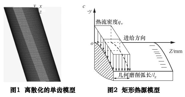 在斜齿磨削过程中,砂轮与齿面接触形成一个以一定速度移动的面热源,导致齿面温度呈瞬时变化。根据能量守恒原则及传热学理论,将磨削过程转化为三维传热问题。在三维传热求解域Ω内,磨削区瞬态温度场的温度变量T(x,y,z,t)在直角坐标系中应该传热平衡,则有方程:
