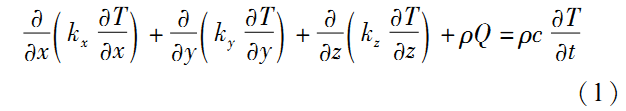 式中:方程右边为微分体吸收的总热量;方程左边前三项分别表示沿着坐标系x、y、z方向传入微分体的热量;方程左边第四项为微分体内热源产生的热量。被加工齿轮没有内热源,故在求解域Ω内ρQ=0。