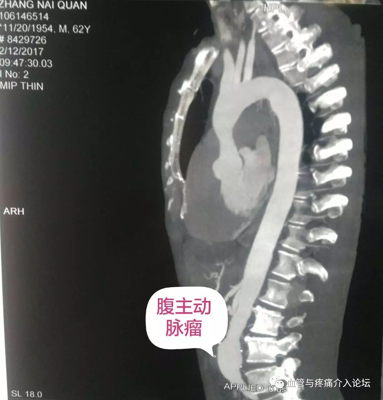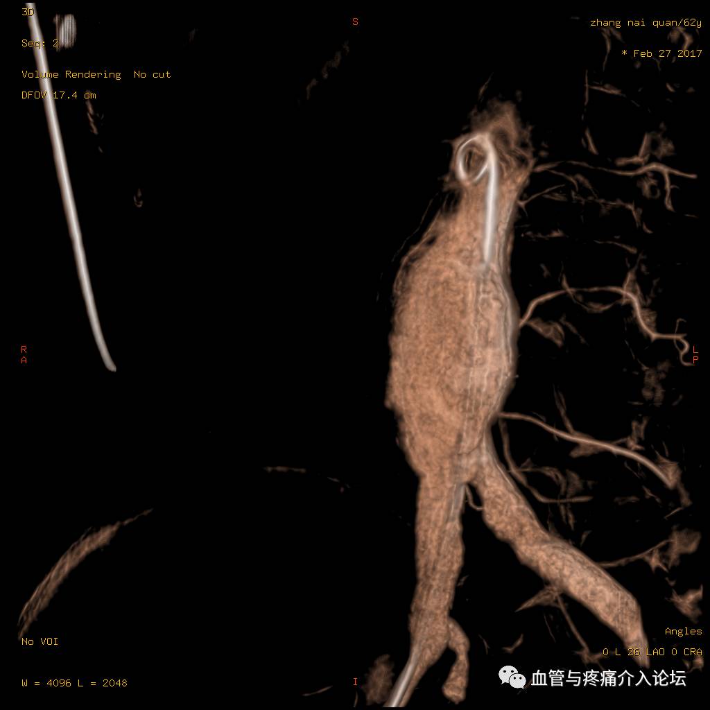 中年男患者,无明显诱因出现背部疼痛,伴右下肢麻木疼痛,不能行走,大汗,无其他不适。行CT考虑腹主动脉瘤,高血压5年,最高血压170/110mmHg ,未系统控制血压.