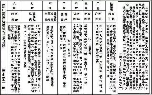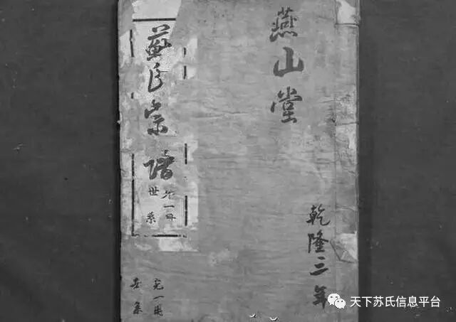 自远古,诸侯因战护国显赫,世封授爵,故有不同官吏小史记载。存于皇室。尊世系,辨昭穆,至秦滅六國,諸侯子孙降為秦國子民。从而姓氏失传。到了魏晉年代,子孙恢复姓氏,以門第分别等级纂譜,家譜存于文人贤达官爵之家,到五季之乱,(907年)譜牒毁于战火之中。迄至宋朝康兴,很多文人贤俊自撰書集兴修譜牒。各姓宗譜稍稍問世,而最显著流传于世的家譜,属蘇氏,欧阳氏!后辈居于晉陵郡.(今常州)。閱《秦氏世譜》實祖淮海先生自下十余世旁衍不詳,但宗系皆皆可考,细看蘇氏世系與淮海在同時年代虽有谱牒盛传,但以皆毁失传。 洋河苏氏来于燕山,洪武避战南迁淮安至居宿遷洋河世居為家,以真祖为始祖寫入宗谱。又以世代相传同遷者兄弟有三,一遷山東一往吴郡,其后辈皆無音讯。但愿燕山有蘇氏全譜。告诉吾辈其宗支脈自宋以来,至于真祖身世,今谱略介其宗来源,不知燕山之宗分以哪支宗脉,真之子孙只能以真公為祖列于首譜,自真祖衍传至今,以达十二世,人口六百余人。后辈為念祖恩,集众人之力建立宗祠,自七世祖从权公倡導,经歷几代人努力,至康熙年間和雍正元年建成,历达一百年形成大祠。長泳公遵询七世祖遗言,為洋河蘇氏宗祠起名《燕山堂》意义深远。