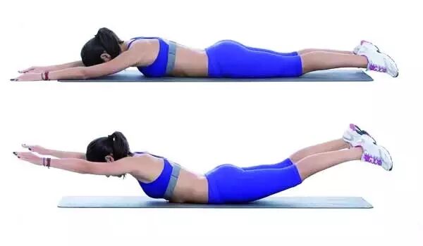 3、燕飞:俯卧床上,双臂向后伸起,双腿向上翘起至最高,坚持5-10秒,循环10次。