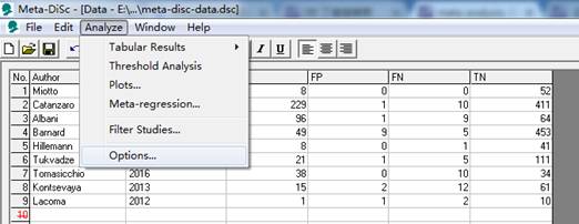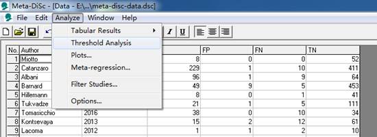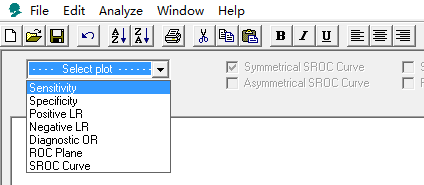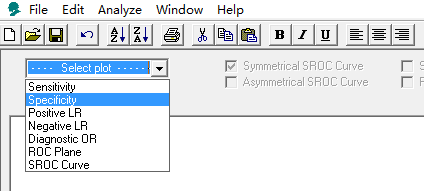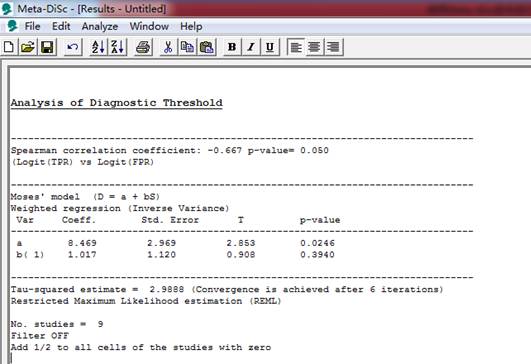 阈值效应检验:通过计算灵敏度对数与(1-特异度)对数的Spearman相关系数=-0.667, P=0.050,表明不存在阈值效应。(强正相关提示有阈值效应)