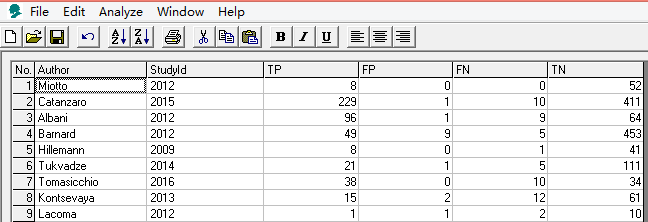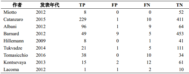 该Meta分析纳入了9个诊断试验,每个诊断试验均给出了真阳性值、假阳性值、假阴性值和真阴性值4个数据。Meta分析的结局指标为合并的灵敏度和特异度,因此属于诊断试验准确性的Meta分析。