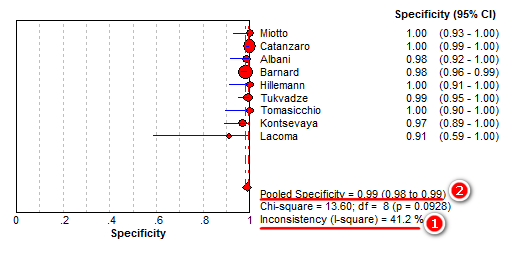 (2)再看合并的特异度及其95% CI:合并的特异度=0.99,95% CI:0.98-0.99。