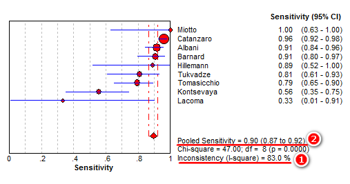 灵敏度的森林图中给出了灵敏度的统计信息包括各个研究的灵敏度及其95%置信区间(Sensitivity (95%CI))、合并的灵敏度及其95%置信区间(Pooled Sensitivity);还给出了异质性检验的结果,包括:Q统计量检验的卡方值(Chi-square)和自由度(df)、I2统计量检验结果(Inconsistency (I-Square))。