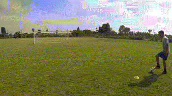在无人防守的时候,我们可以先趟一步球为自己接下来的射门助力,踩球的上半部分,将皮球向前趟几步。射门时,可以用斜线跑的防守助跑,然后将球射向球门。